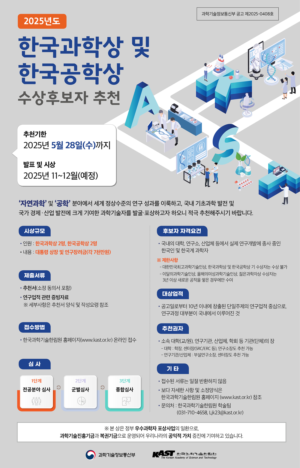 [한국과학기술한림원] 2025년 한국과학상 및 한국공학상(대통령상) 수상후보자 추천 요청