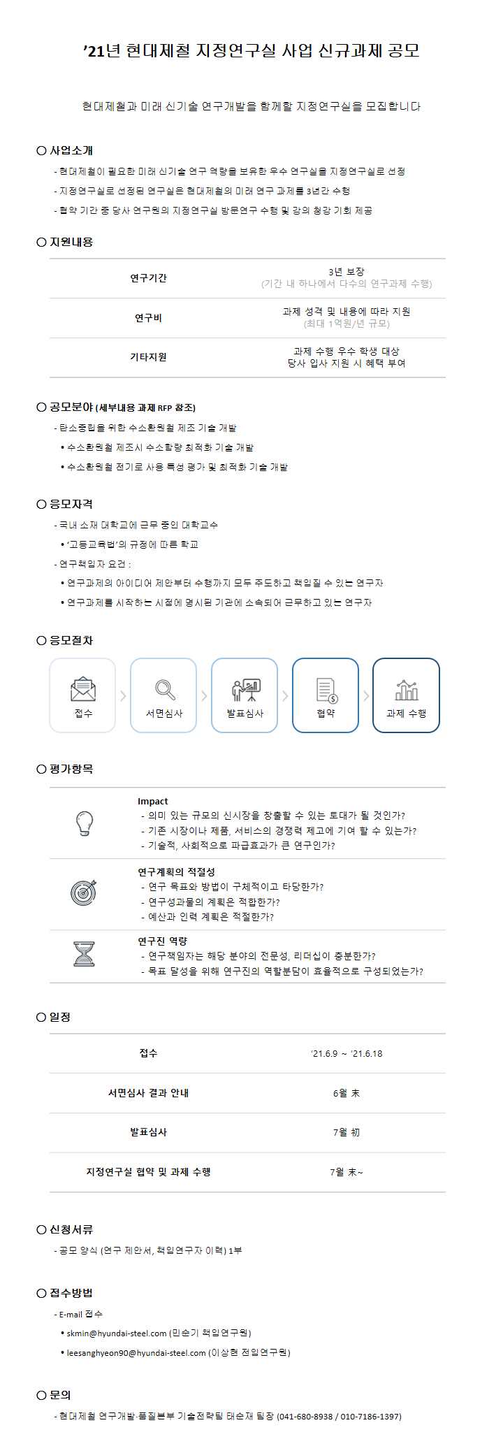 [현대제철] 2021년 지정연구실 사업 신규과제 공모 안내 (마감: 6월 18일 까지)